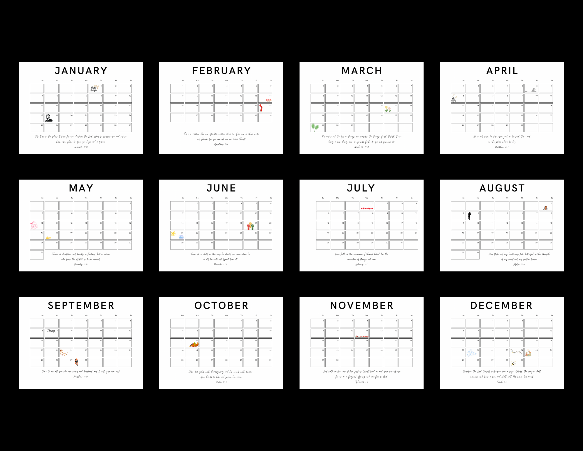 Alongside these features, the calendar include Scripture for each month and beautifully designed monthly layouts that make it both meaningful and practical for everyday use.